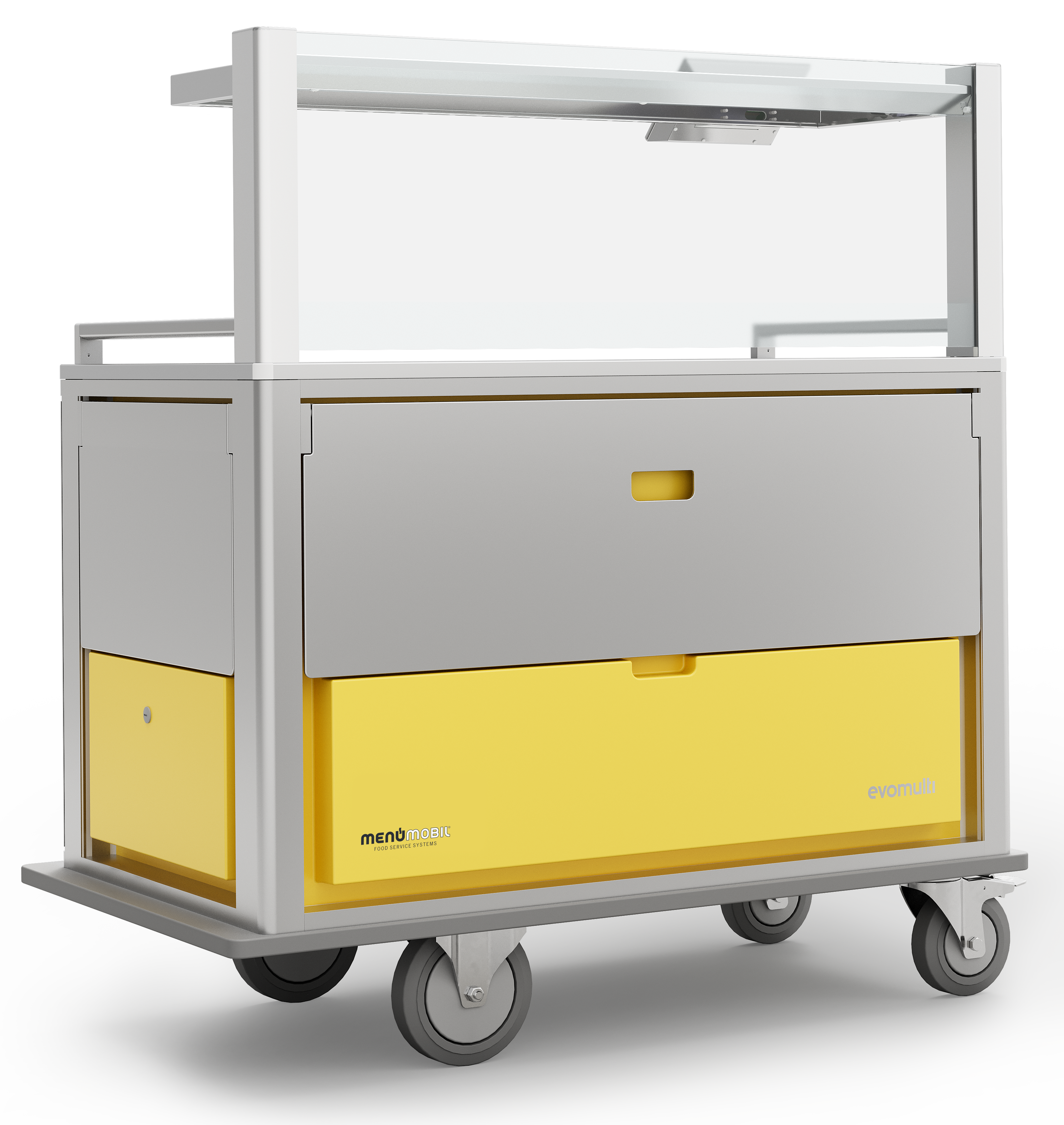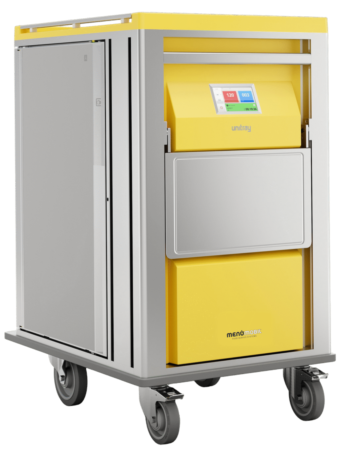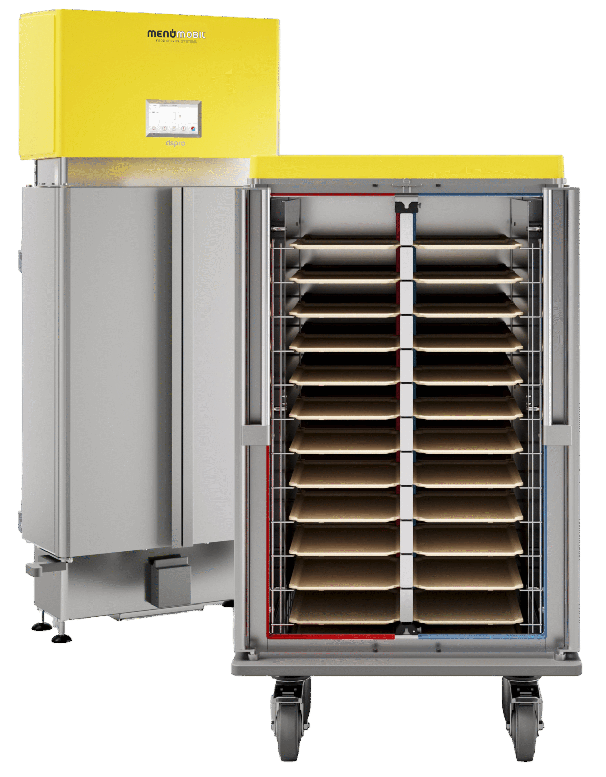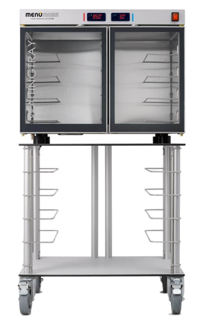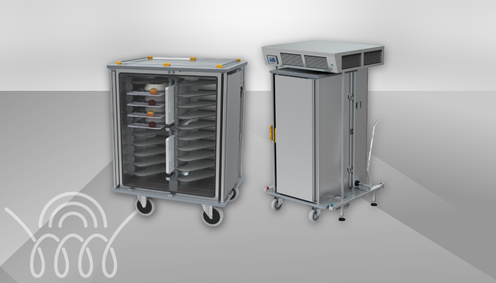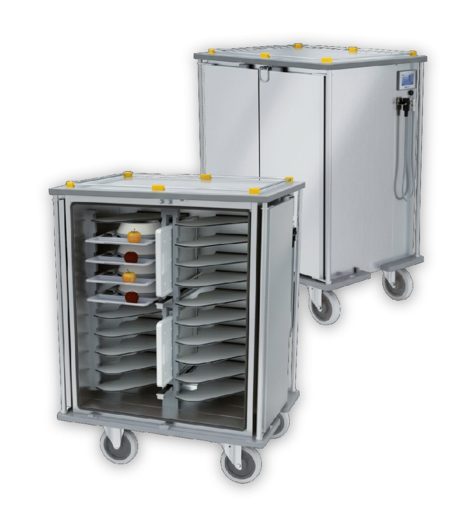 Bei der integrierten Technik ist die gesamte Steuerung direkt im Transportwagen verbaut. Das System ist dadurch standortunabhängig einsetzbar und funktioniert per Plug and Play – einfach auf die Station bringen, ans Stromnetz anschließen, fertig. Induktion und aktive Umlufttkühlung arbeiten gemeinsam in einem kompakten Wagen, der trotz geringer Abmessungen bis zu 24 Tabletts aufnehmen kann. Ideal für Einrichtungen, die maximale Flexibilität ohne externe Infrastruktur benötigen.