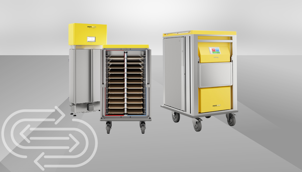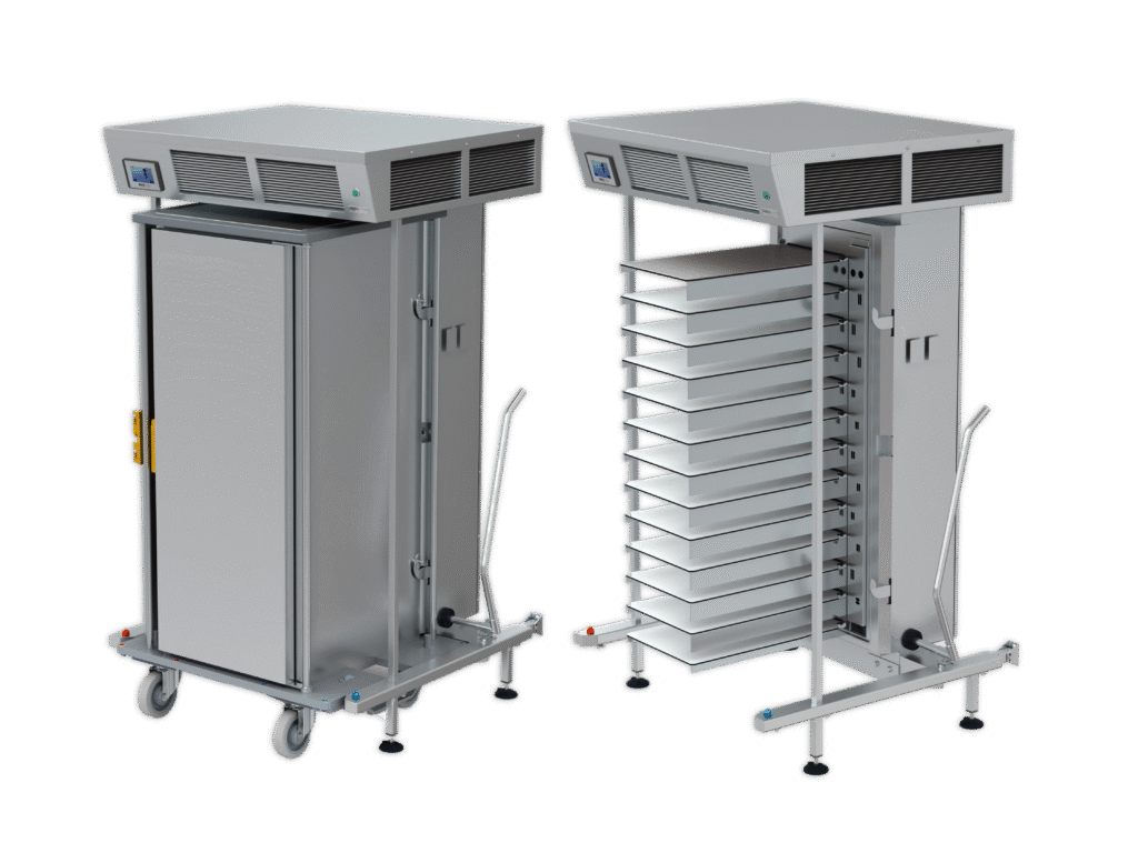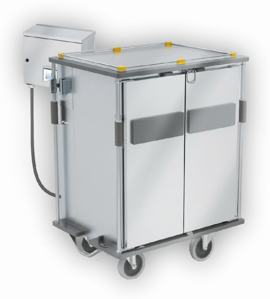 Bei den Andockstation Systemen bleibt der Transportwagen bewusst technikfrei und dadurch schlank, leicht und besonders einfach zu manövrieren. Regeneration und Kühlung erfolgen über die Andockstation, sobald der Wagen gekoppelt wird. Das kann Anschaffung und Betrieb wirtschaftlicher machen, weil Technik nicht in jedem Wagen mehrfach vorhanden sein muss. Gleichzeitig bleibt der Ablauf effizient, weil die thermische Trennung und die Temperaturführung systemisch gelöst sind, ohne dass der Wagen schwer oder komplex wird.